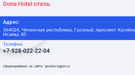 Dona Hotel, отель по адресу 364024, Чеченская республика, Грозный, проспект Хусейна Исаева, 85 в дальнейшем Организация, размещена в следующих категориях: