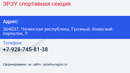 ЭРЗУ, спортивная секция по адресу 364037, Чеченская республика, Грозный, Киевский переулок, 9 в дальнейшем Организация, размещена в следующих категориях: