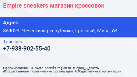 Empire sneakers, магазин кроссовок по адресу 364024, Чеченская республика, Грозный, Мира, 64 в дальнейшем Организация, размещена в следующих категориях: