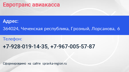 Евротранс, авиакасса по адресу 364024, Чеченская республика, Грозный, Лорсанова, 6 в дальнейшем Организация, размещена в следующих категориях: