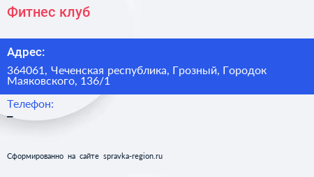 Фитнес-клуб по адресу 364061, Чеченская республика, Грозный, Городок Маяковского, 136/1 в дальнейшем Организация, размещена в следующих категориях: