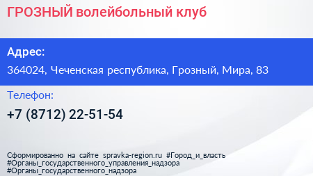 ГРОЗНЫЙ, волейбольный клуб по адресу 364024, Чеченская республика, Грозный, Мира, 83 в дальнейшем Организация, размещена в следующих категориях: