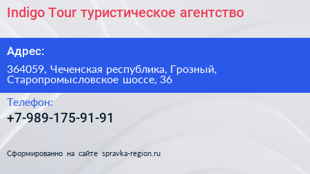 Indigo Tour, туристическое агентство по адресу 364059, Чеченская республика, Грозный, Старопромысловское шоссе, 36 в дальнейшем Организация, размещена в следующих категориях: