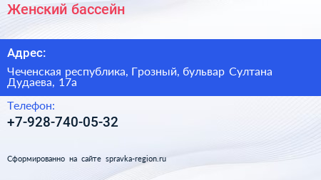 Женский бассейн по адресу Чеченская республика, Грозный, бульвар Султана Дудаева, 17а в дальнейшем Организация, размещена в следующих категориях: