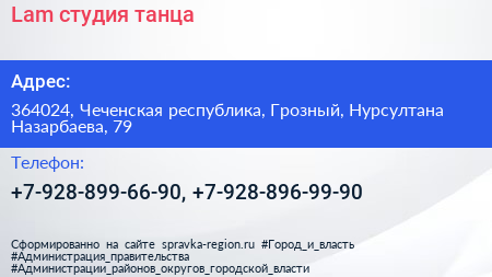 Lam, студия танца по адресу 364024, Чеченская республика, Грозный, Нурсултана Назарбаева, 79 в дальнейшем Организация, размещена в следующих категориях: