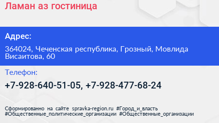 Ламан аз, гостиница по адресу 364024, Чеченская республика, Грозный, Мовлида Висаитова, 60 в дальнейшем Организация, размещена в следующих категориях: