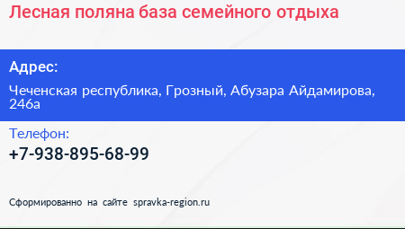 Лесная поляна, база семейного отдыха по адресу Чеченская республика, Грозный, Абузара Айдамирова, 246а в дальнейшем Организация, размещена в следующих категориях: