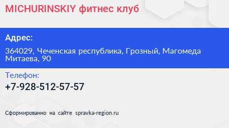 MICHURINSKIY, фитнес-клуб по адресу 364029, Чеченская республика, Грозный, Магомеда Митаева, 90 в дальнейшем Организация, размещена в следующих категориях: