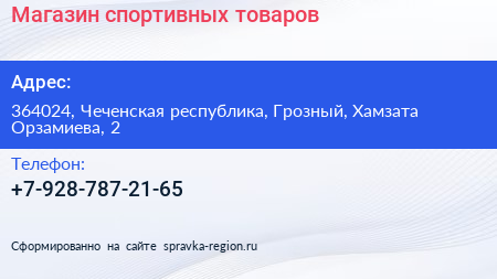 Магазин спортивных товаров по адресу 364024, Чеченская республика, Грозный, Хамзата Орзамиева, 2 в дальнейшем Организация, размещена в следующих категориях: