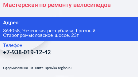 Мастерская по ремонту велосипедов по адресу 364058, Чеченская республика, Грозный, Старопромысловское шоссе, 23г в дальнейшем Организация, размещена в следующих категориях: