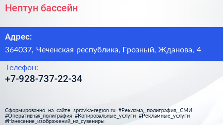 Нептун, бассейн по адресу 364037, Чеченская республика, Грозный, Жданова, 4 в дальнейшем Организация, размещена в следующих категориях: