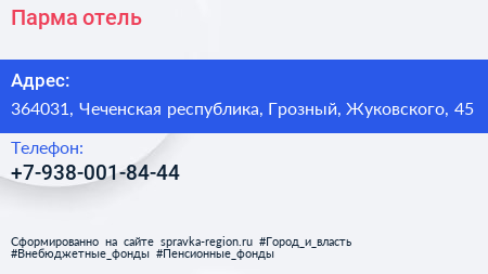 Парма, отель по адресу 364031, Чеченская республика, Грозный, Жуковского, 45 в дальнейшем Организация, размещена в следующих категориях:
