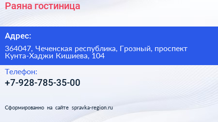 Раяна, гостиница по адресу 364047, Чеченская республика, Грозный, проспект Кунта-Хаджи Кишиева, 104 в дальнейшем Организация, размещена в следующих категориях: