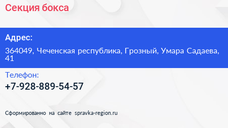 Секция бокса по адресу 364049, Чеченская республика, Грозный, Умара Садаева, 41 в дальнейшем Организация, размещена в следующих категориях: