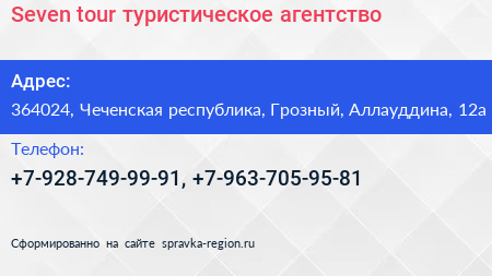 Seven tour, туристическое агентство по адресу 364024, Чеченская республика, Грозный, Аллауддина, 12а в дальнейшем Организация, размещена в следующих категориях: