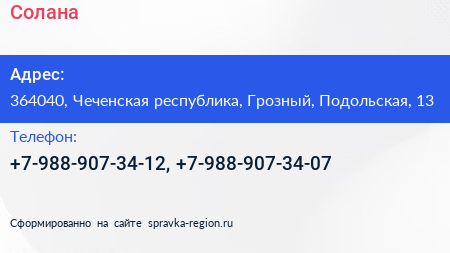 Солана по адресу 364040, Чеченская республика, Грозный, Подольская, 13 в дальнейшем Организация, размещена в следующих категориях: