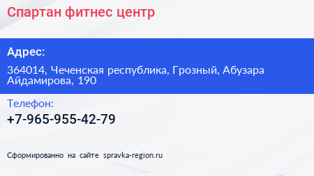 Спартан, фитнес-центр по адресу 364014, Чеченская республика, Грозный, Абузара Айдамирова, 190 в дальнейшем Организация, размещена в следующих категориях: