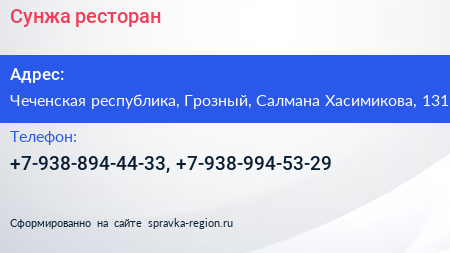 Сунжа, ресторан по адресу Чеченская республика, Грозный, Салмана Хасимикова, 131 в дальнейшем Организация, размещена в следующих категориях: