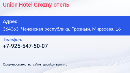 Union Hotel Grozny, отель по адресу 364063, Чеченская республика, Грозный, Мирзоева, 16 в дальнейшем Организация, размещена в следующих категориях: