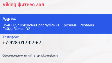 Viking, фитнес-зал по адресу 364037, Чеченская республика, Грозный, Ризвана Гайдабаева, 32 в дальнейшем Организация, размещена в следующих категориях: