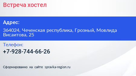 Встреча, хостел по адресу 364024, Чеченская республика, Грозный, Мовлида Висаитова, 25 в дальнейшем Организация, размещена в следующих категориях: