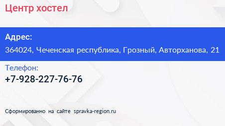 Центр, хостел по адресу 364024, Чеченская республика, Грозный, Авторханова, 21 в дальнейшем Организация, размещена в следующих категориях:
