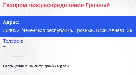 Газпром газораспределение Грозный по адресу 364059, Чеченская республика, Грозный, Вахи Алиева, 38 в дальнейшем Организация, размещена в следующих категориях: