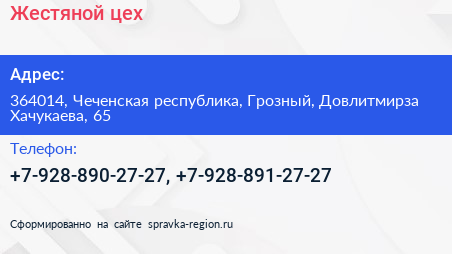 Жестяной цех по адресу 364014, Чеченская республика, Грозный, Довлитмирза Хачукаева, 65 в дальнейшем Организация, размещена в следующих категориях: