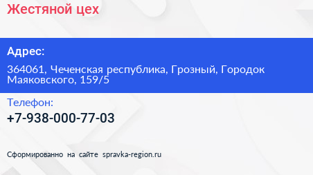 Жестяной цех по адресу 364061, Чеченская республика, Грозный, Городок Маяковского, 159/5 в дальнейшем Организация, размещена в следующих категориях: