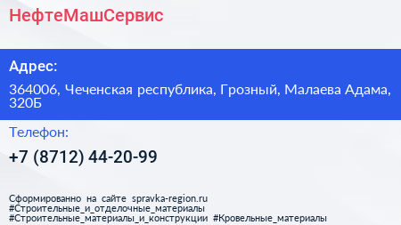 НефтеМашСервис по адресу 364006, Чеченская республика, Грозный, Малаева Адама, 320Б в дальнейшем Организация, размещена в следующих категориях: