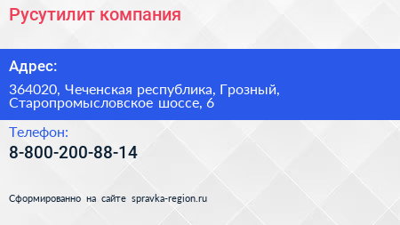 Русутилит, компания по адресу 364020, Чеченская республика, Грозный, Старопромысловское шоссе, 6 в дальнейшем Организация, размещена в следующих категориях: