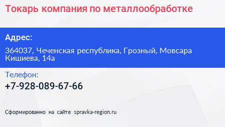 Токарь, компания по металлообработке по адресу 364037, Чеченская республика, Грозный, Мовсара Кишиева, 14а в дальнейшем Организация, размещена в следующих категориях:
