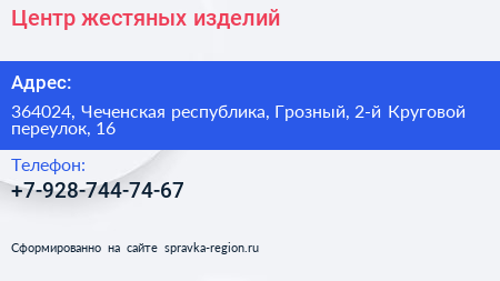 Центр жестяных изделий по адресу 364024, Чеченская республика, Грозный, 2-й Круговой переулок, 16 в дальнейшем Организация, размещена в следующих категориях: