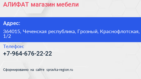 АЛИФАТ, магазин мебели по адресу 364015, Чеченская республика, Грозный, Краснофлотская, 1/2 в дальнейшем Организация, размещена в следующих категориях: