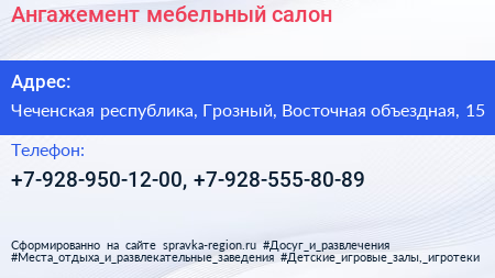 Ангажемент, мебельный салон по адресу Чеченская республика, Грозный, Восточная объездная, 15 в дальнейшем Организация, размещена в следующих категориях: