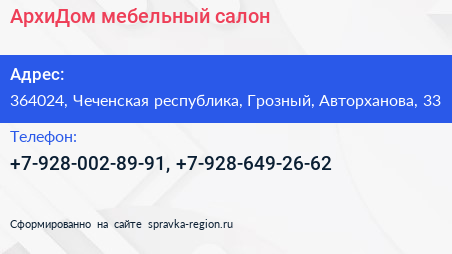 АрхиДом, мебельный салон по адресу 364024, Чеченская республика, Грозный, Авторханова, 33 в дальнейшем Организация, размещена в следующих категориях: