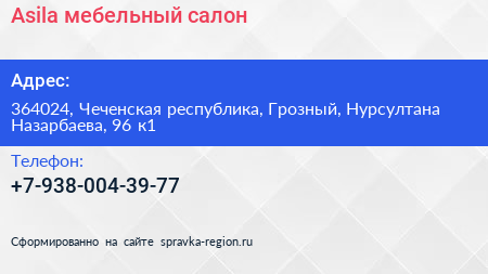Asila, мебельный салон по адресу 364024, Чеченская республика, Грозный, Нурсултана Назарбаева, 96 к1 в дальнейшем Организация, размещена в следующих категориях: