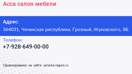 Асса, салон мебели по адресу 364031, Чеченская республика, Грозный, Жуковского, 8Б в дальнейшем Организация, размещена в следующих категориях: