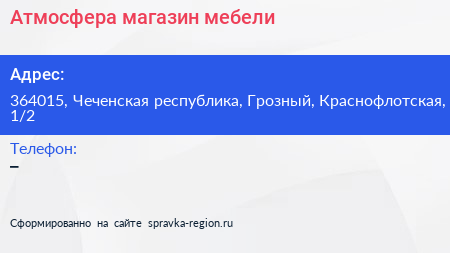 Атмосфера, магазин мебели по адресу 364015, Чеченская республика, Грозный, Краснофлотская, 1/2 в дальнейшем Организация, размещена в следующих категориях: