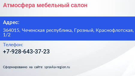 Атмосфера, мебельный салон по адресу 364015, Чеченская республика, Грозный, Краснофлотская, 1/2 в дальнейшем Организация, размещена в следующих категориях:
