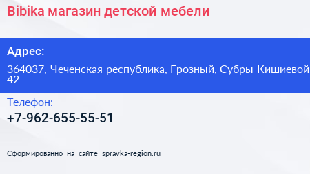 Bibika, магазин детской мебели по адресу 364037, Чеченская республика, Грозный, Субры Кишиевой, 42 в дальнейшем Организация, размещена в следующих категориях: