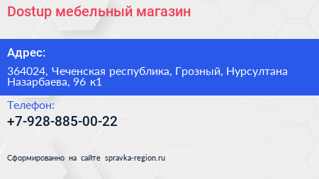Dostup, мебельный магазин по адресу 364024, Чеченская республика, Грозный, Нурсултана Назарбаева, 96 к1 в дальнейшем Организация, размещена в следующих категориях: