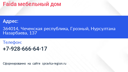 Faida, мебельный дом по адресу 364014, Чеченская республика, Грозный, Нурсултана Назарбаева, 137 в дальнейшем Организация, размещена в следующих категориях: