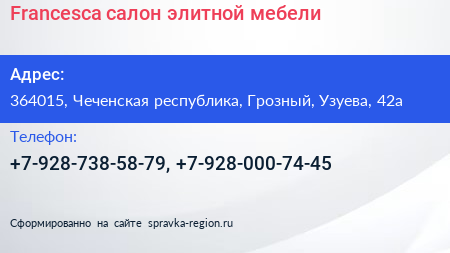 Francesca, салон элитной мебели по адресу 364015, Чеченская республика, Грозный, Узуева, 42а в дальнейшем Организация, размещена в следующих категориях: