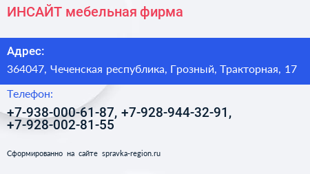 ИНСАЙТ, мебельная фирма по адресу 364047, Чеченская республика, Грозный, Тракторная, 17 в дальнейшем Организация, размещена в следующих категориях: