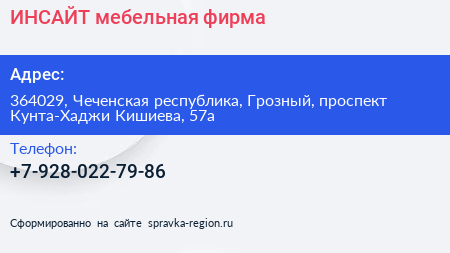 ИНСАЙТ, мебельная фирма по адресу 364029, Чеченская республика, Грозный, проспект Кунта-Хаджи Кишиева, 57а в дальнейшем Организация, размещена в следующих категориях: