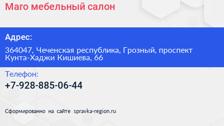 Maro, мебельный салон по адресу 364047, Чеченская республика, Грозный, проспект Кунта-Хаджи Кишиева, 66 в дальнейшем Организация, размещена в следующих категориях: