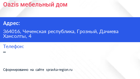 Oazis, мебельный дом по адресу 364016, Чеченская республика, Грозный, Дачиева Хансолты, 4 в дальнейшем Организация, размещена в следующих категориях: