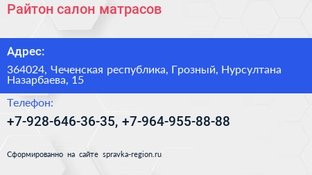 Райтон, салон матрасов по адресу 364024, Чеченская республика, Грозный, Нурсултана Назарбаева, 15 в дальнейшем Организация, размещена в следующих категориях:
