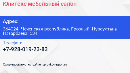 Юнитекс, мебельный салон по адресу 364024, Чеченская республика, Грозный, Нурсултана Назарбаева, 134 в дальнейшем Организация, размещена в следующих категориях: